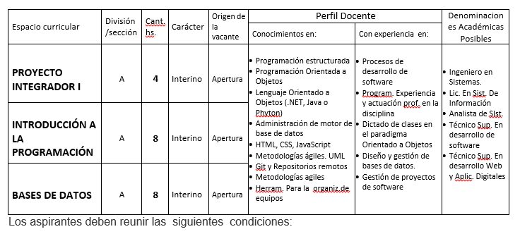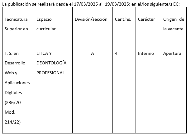 | Tecnicatura Superior en | Espacio curricular | División/sección | Cant.hs. | Carácter | Origen de la vacante |